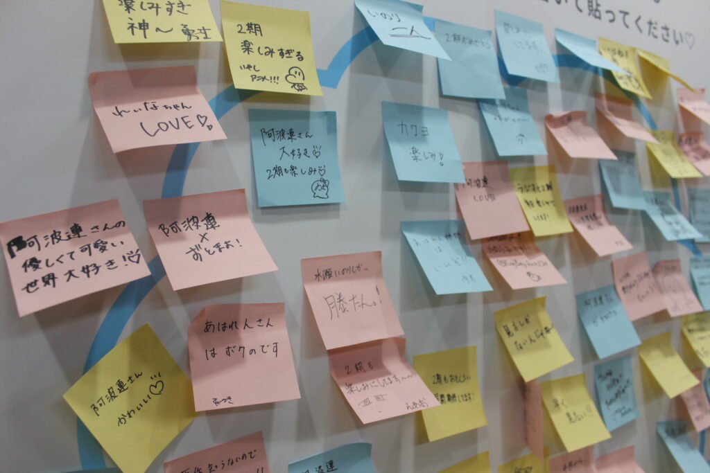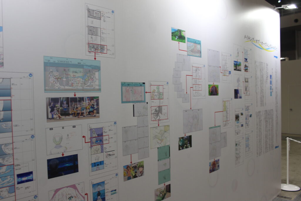そして、アニメのイベントにおいて最も魅力的なところは断然、制作の裏側を垣間見ることができる点でした。アニメーション制作の隠された物語—企画から設定、背景美術、撮影まで—を知れるのは作品好きのファンに対しては間違いなく大好物でしょう。展示された原画と原撮を見れることで、私たちが普段何気なく見ているアニメがどのように作られ、クリエイターたちがどんな思いで制作に向き合っているかを、ファンの知りたい視点から紹介していました。この「制作プロセスの公開」はゲームイベントではあまり見られない気がしますが、皆さんはどう思いますか?