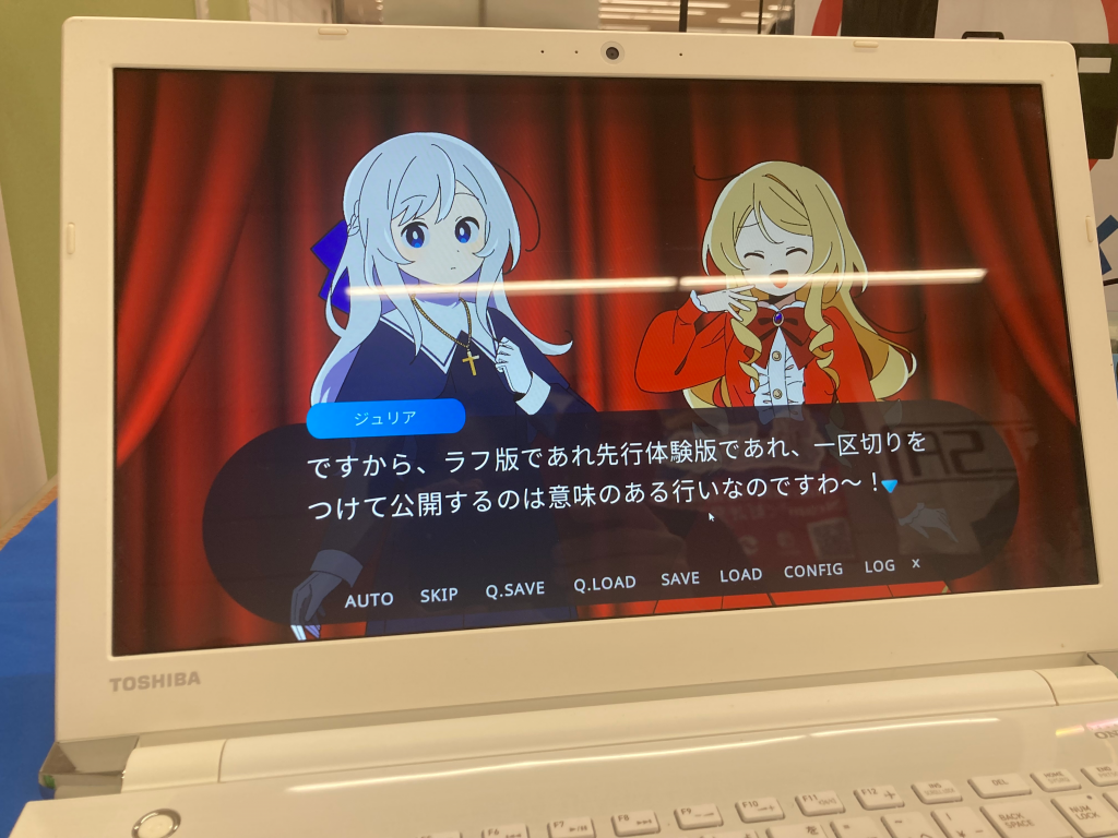 The first game I want to introduce is “就活シスターエリーゼ!”. This game truly exceeded expectations right from the start. When I arrived at the booth, the person in charge unexpectedly explained, “The demo version only includes the novel part, and the interview part has bugs, so please let us know if you want to play it.”