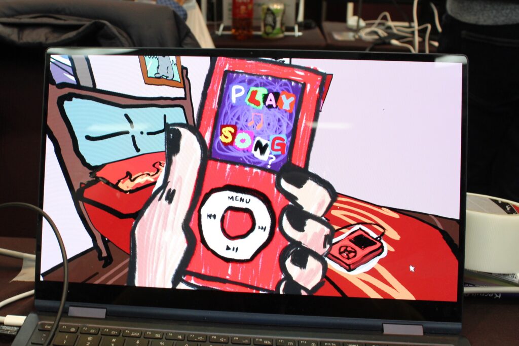 次に紹介するのは「I Write Games Not Tragedies」です。最初に目を引いたのは何より独特のアートスタイルでした。Steamページでも紹介されているように、このゲームはイギリスのエモスタイルとゴスサブカルチャーに大きな影響を受けています。普段あまり見かけない荒々しいアートスタイルと、ノートパソコンの横に置かれたマイクが気になって、すぐにプレイしてみることにしました。